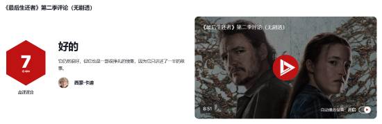 IGN简评:将《最后生还者:第二部》庞大而曲折的故事改编成一部跨越多季的电视剧始终是一个挑战,而且在制作过程中途,也无法判断最终能否够成功。HBO《最后生还者》真人剧第二季绝非糟糕的剧集,它制作精良,看起来非常华丽,而且充满了出色的表演。但在叙事手法、节奏以及关键事件的布局上所做出的选择,与想达到的效果背道而驰,最终无法让这个故事中无可置疑的震撼事件产生应有的效果,这部剧还不错,只是到目前为止还比不上其出色的游戏原著(或第一季)。