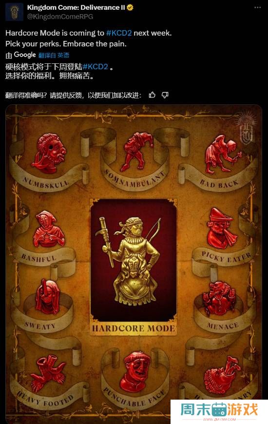 《天国:拯救2》官方宣布,硬核模式预计于下周正式上线,从官方公开的宣传图中所展示的“硬核模式”内容包括笨蛋、梦游者、背痛、挑食者、腼腆、出汗、威胁、饥饿的亨利、会被打脸、脚步沉重这些选项。