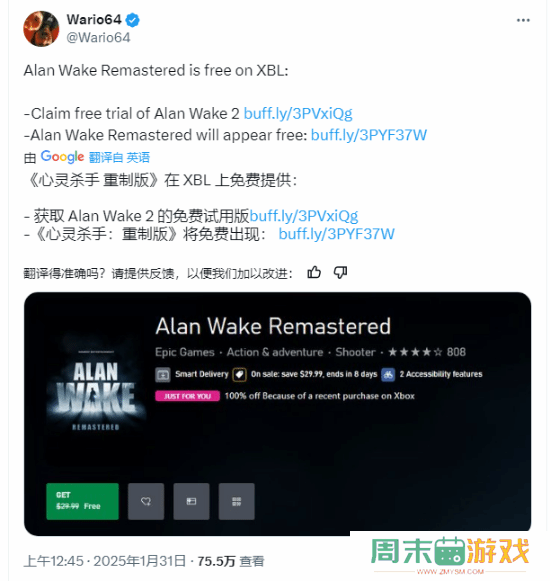 近期,Xbox平台上发生了一起意外的游戏赠送事件,引发了广泛关注。事件的起因可以追溯到今年1月底,Xbox为玩家提供了一次《心灵杀手2》的免费试玩周末活动。然而,在这次活动中,用户们意外发现了一个“福利”:通过领取试玩版,他们不仅能体验游戏内容,还能额外获得《心灵杀手:复刻版》,并且这一版本可以永久保留。