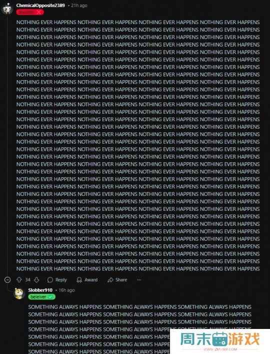 事实上,这整件事进一步加剧了“怀疑者”和“坚信者”之间的对立。我能找到的几乎每个帖子都展现了这两个阵营之间近乎神话般的冲突;一位“末日预言者”在另一个帖子中写道:“一有机会就要怀疑。” 而代表着人类不屈精神的人回应道:“绝不。” 下面是这种冲突更激烈的一种表现形式。